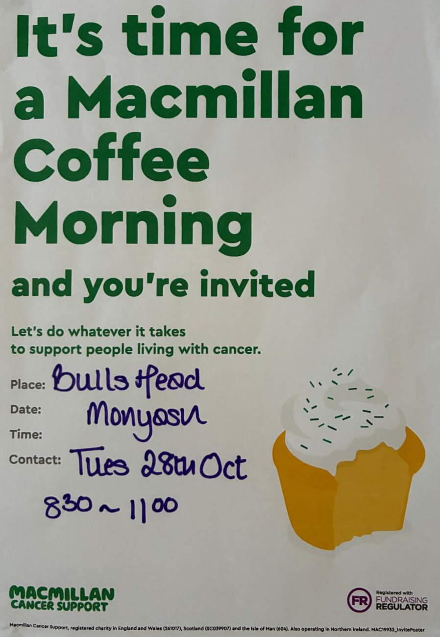 - The Bull’s Head will be hosting a Macmillan Coffee Morning on Tuesday 28th October. Check out the poster which you can read or download here. Please mark your diary, then just turn up and make a donation to Macmillan. Baking donations and raffle prizes are welcome, but the most important thing is to just be there. You can find out more about Macmillan on their website here.